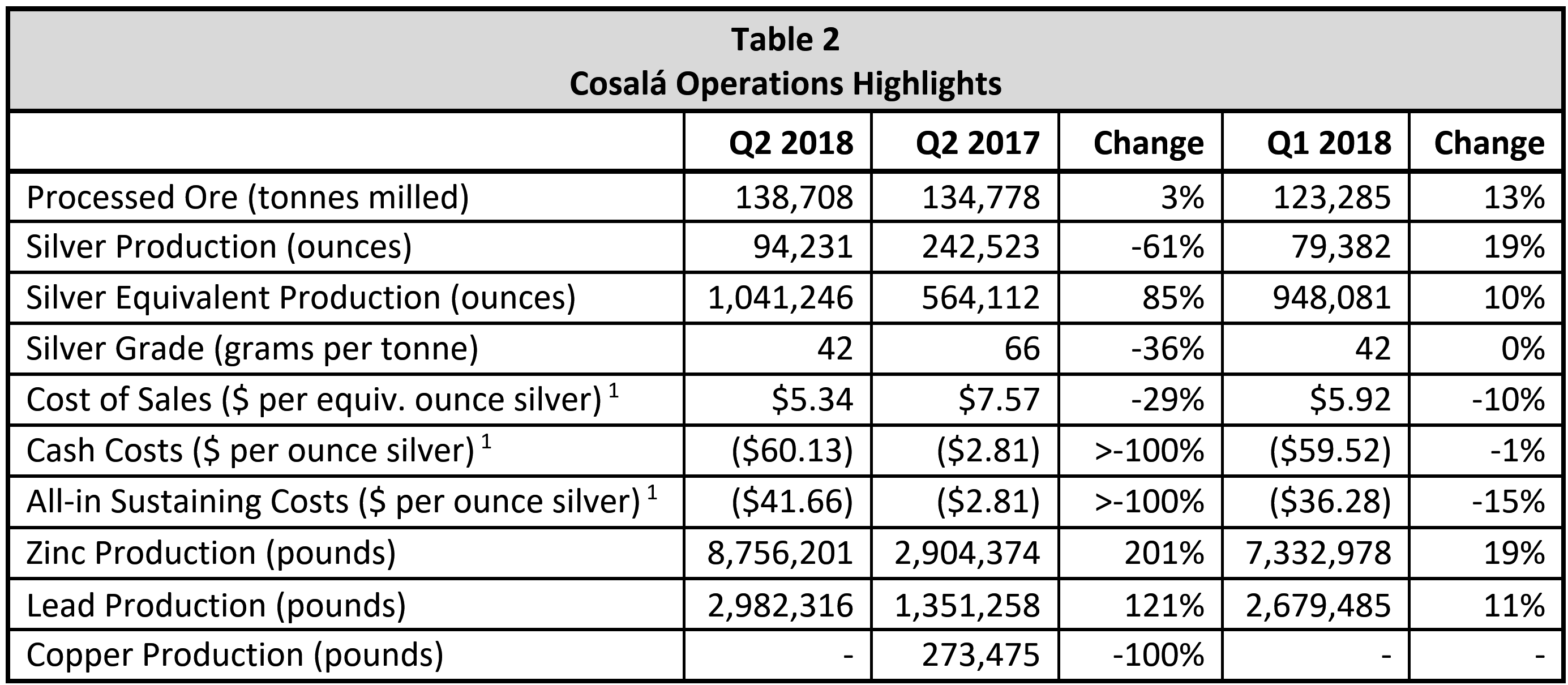 Consolidated silver production for the second quarter of 2018 was 301,711 silver ounces which represents a decrease of 24% over the previous quarter and 46% year-over-year. Silver equivalent production was approximately 1.5 million ounces, down 9% over the previous quarter and up 24% year-over-year. The increase in the milling rate achieved at Cosalá Operations was offset by the lower tonnage at the Galena Complex during the quarter. Consolidated cash costs decreased 125% to negative ($6.15) per silver ounce comparted to previous quarter and 185% year-over-year, and AISC decreased 13% to $5.40 per silver ounce compared to the previous quarter and 49% year-over-year. Consolidated zinc production increased by 19% compared to Q1, 2018 and 201% compared to Q2, 2017; consolidated lead production decreased by 18% compared to Q1, 2018. The decreases in silver, silver equivalent, silver grade, and lead production compared to Q1, 2018 are primarily due the issues associated with the No.3 Shaft at the Galena Complex.
