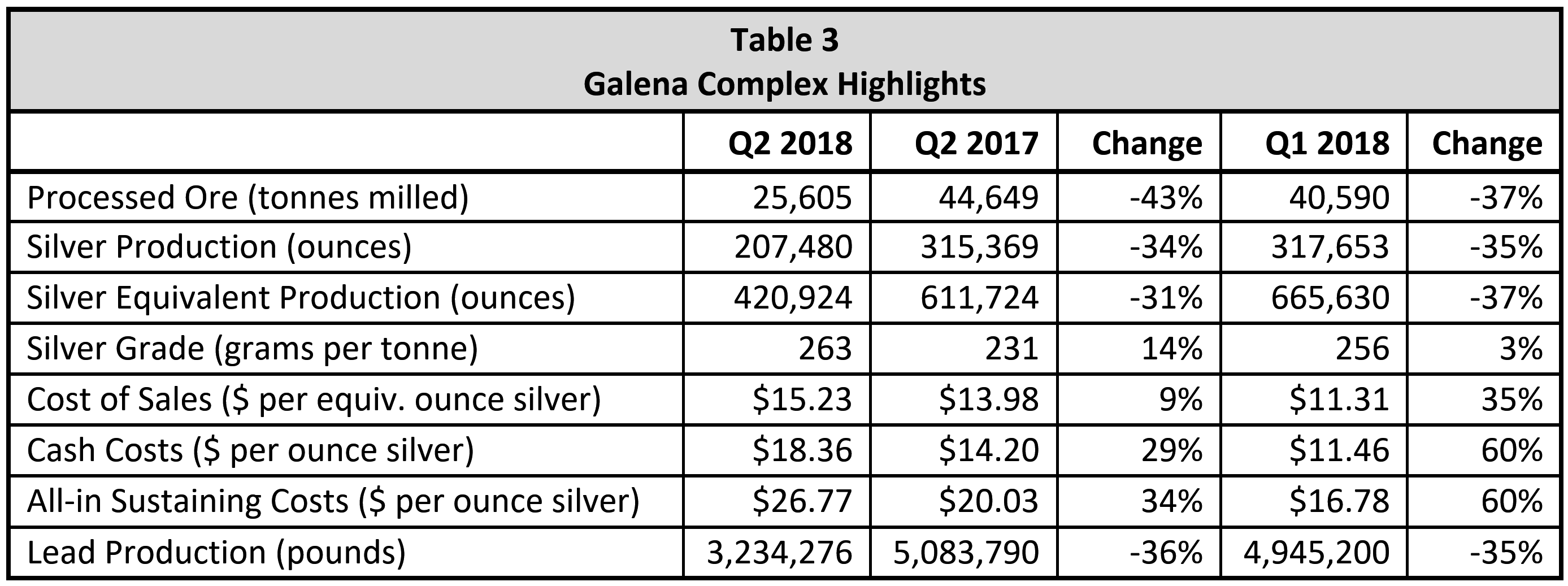As a result, the Galena Complex produced 207,480 ounces of silver and 420,924 ounces of silver equivalent during the second quarter of 2018 at cash costs of $18.36 per silver ounce and AISC of $26.77 per silver ounce. Silver and silver equivalent production decreased 35% and 37%, respectively, compared to the previous quarter, and decreased 34% and 31%, respectively, year-over-year. Cash costs increased by 60% compared to the prior quarter and 29% year-over-year, and AISC were up 60% compared to the prior quarter and 34% year-over-year.