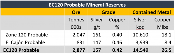 The Probable Mineral Reserve estimate for EC120 as at April 3, 2019 is presented below.