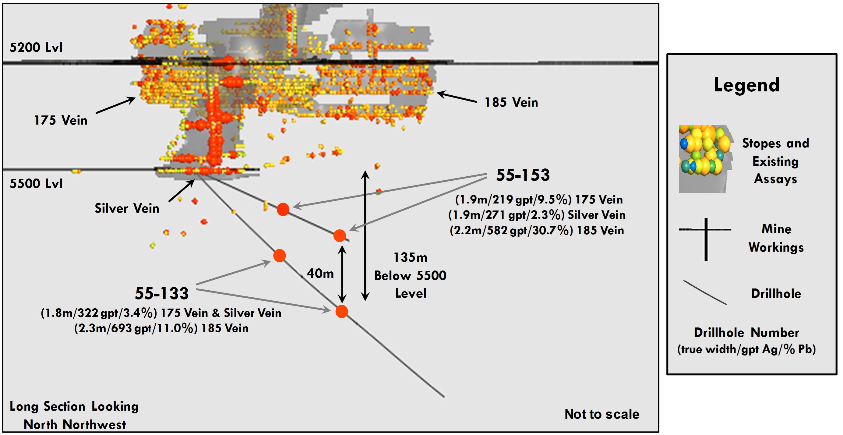- Hole 55-133 intersected both the 185 and 175 Veins with significant grade and widths, approximately 135 meters below the 5500 Level: