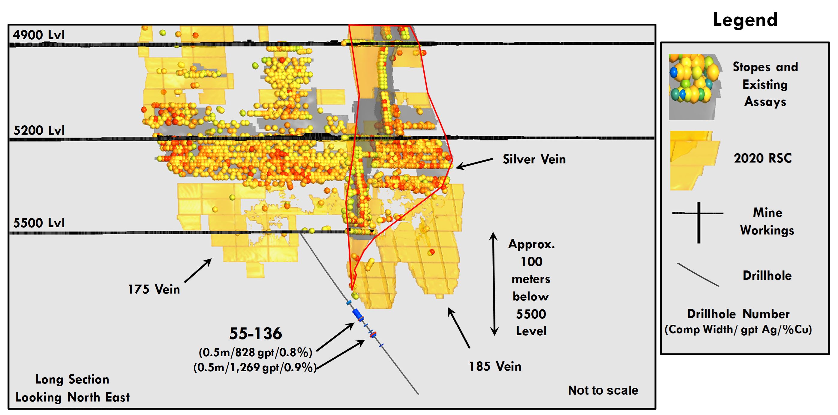 - Hole 55-136 targeting the Silver Vein, 110 meters west of the Triple Point and over 100 meters below the 5500 Level, intersected high-grade silver: