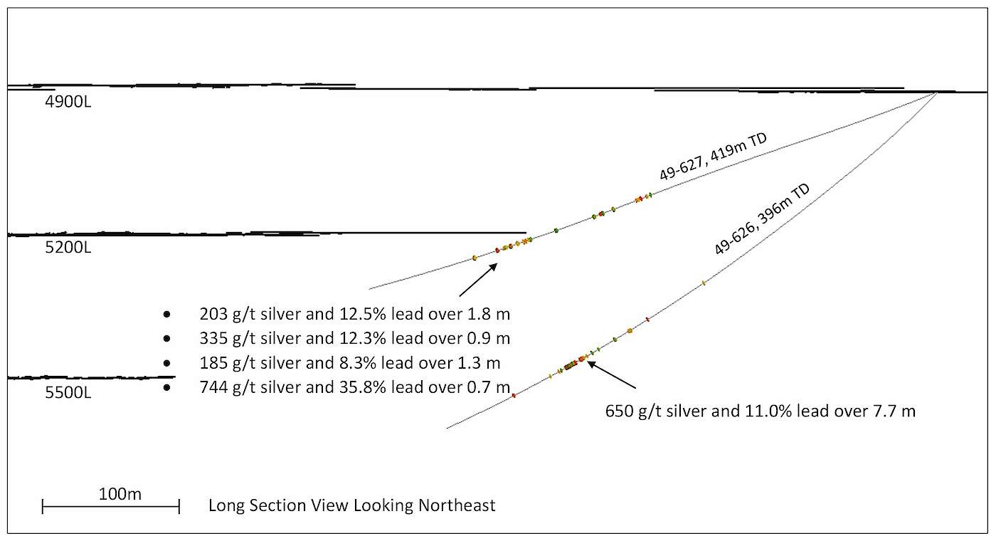 including: 521 g/t silver and 24.5% lead (1,404 g/t silver equivalent) over 1.1 m - Hole 49-626: 650 g/t silver and 11% lead (1,054 g/t silver equivalent) over 7.7 m