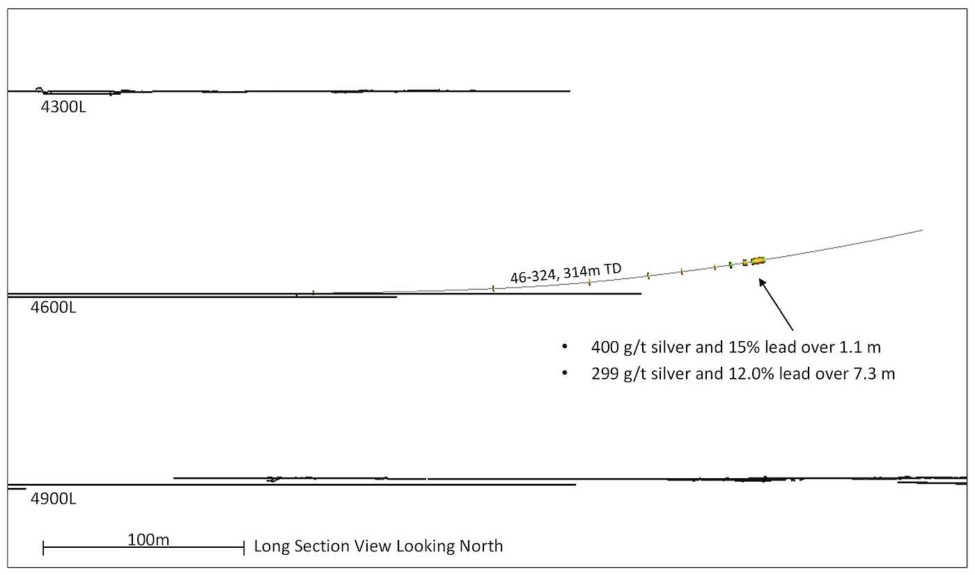 Hole 46-324: 400 g/t silver and 15% lead (942 g/t silver equivalent) over 1.1 m